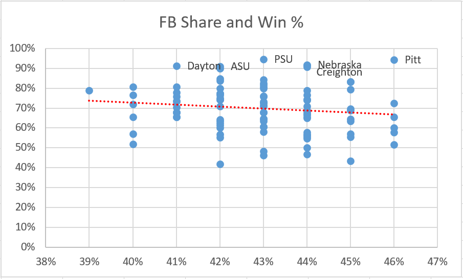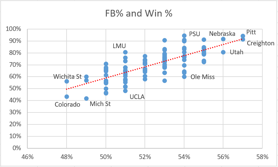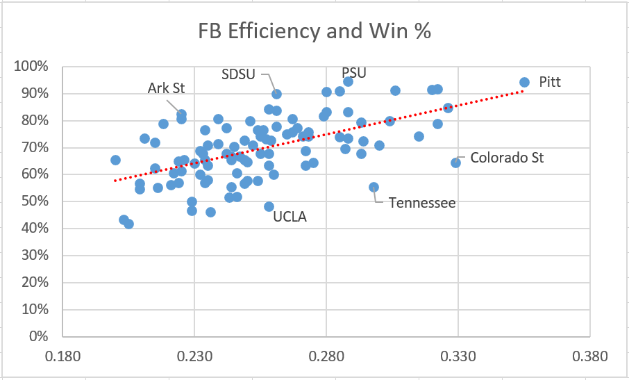 No surprise to see a fairly strong correlation here. You can predict overall Win % fairly well from knowing just your FB Efficiency. It was rare for a team to be at 80% Win % and below 0.260 efficiency, although you see a team like Arkansas St as a noteable exception. And most of the teams over 0.280 FB Efficiency were at 70%+ Win %, although you see Tennessee and Colorado State as noteable outliers to the downside.