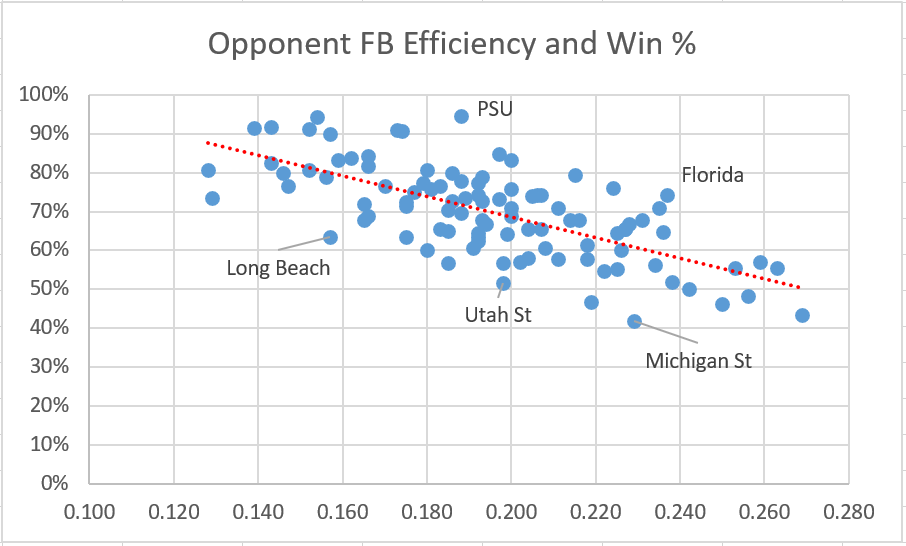 I was surprised to see that Opponent FB Efficiency had a higher correlation to winning that FB Efficiency.1 The spread here is tighter and there’s fewer obvious deviations off the trendline, but I highlighted a few here.