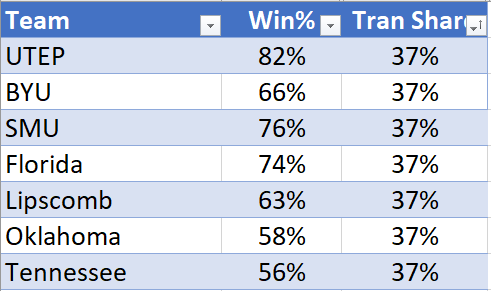 No surprise here to see so many of the best teams in the country clustered at the top. If you can win close to 60% of the Transition rallies, you’re going to dominate a lot of games. And if you read the playoff breakdowns, you can see that Transition success determined winning, to a large extent.