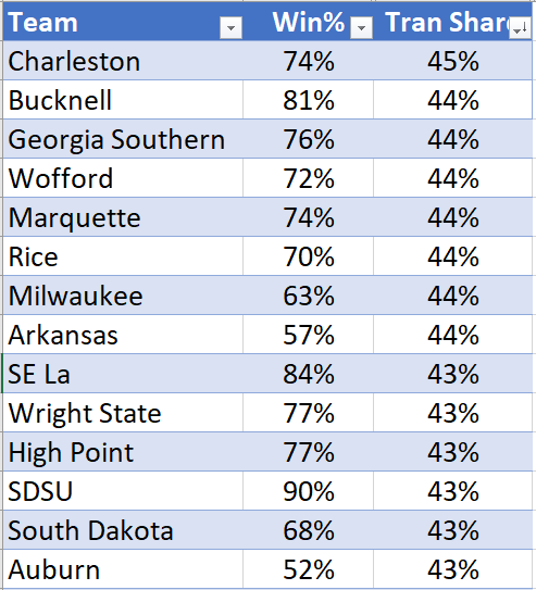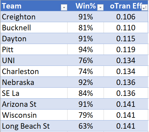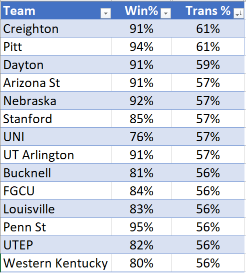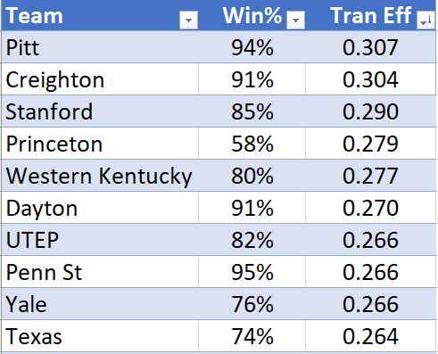 And here’s the teams who limited opponent transition attack the best. Creighton and Pitt, both right near the top again. No surprise they were in the mix for the National Championship!