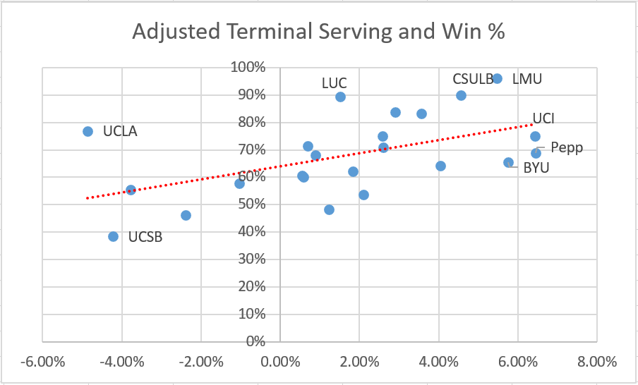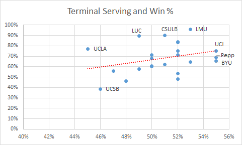 The mediocre position of both Long Beach and Loyola Chicago on this graph also highlights a downside of using “% of Terminal Serves” on a season-wide sample for men’s volleyball: dominant teams in a high sideout environment show poorly on this measure because everybody serves significantly more aces than errors and when you win a lot of points, you are serving more often than your opponents.