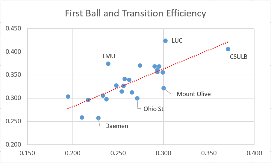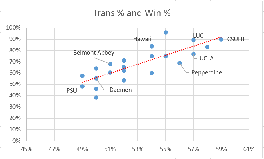 If you recall, about 40% of the NCAA women’s game is played in Transition. There’s more First Ball and a lot more Terminal Serving in NCAA men’s. Yet the Transition differential is just as influential on winning. Part of that is almost certainly co-correlation with the other aspects.