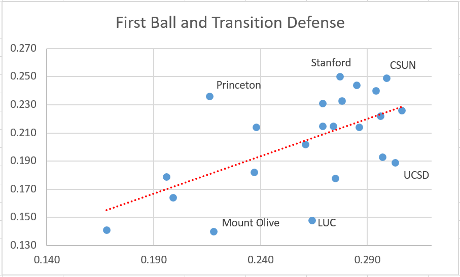 We see less correlation (0.60). That’s still fairly high, but it is interesting nonetheless. In the LOVB Women’s season, how good you were in First Ball Offense didn’t really predict how good you were in Transition Offense. But in this recent NCAA Men’s season, it did. On the flip side, how good you were in First Ball Defense very strongly predicted how good you were in Transition Defense in the LOVB Women’s season, but the correlation, while still fairly high, wasn’t as strong in the NCAA Men’s season.