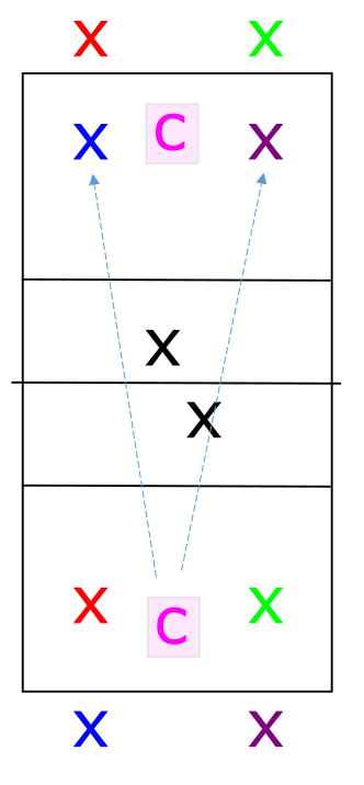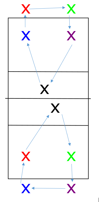 In this case, the “Reds” and “Greens” alternate between passing and serving in zone 5 for the whole round, then they become the targets (on both sides of the net), then they alternate between passing and serving in zone 1. This is a good setup if you are focusing more on either serving or passing but want to get the reps in the other skill. For example, if your focus is more on serving, you stand back with the server in that pairs group. You can give a cue for their serve, then after serving that player will go pass, and then come back to serve again. So you are tutoring them on their serving, while their passing is more, “independent study.”