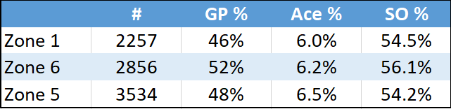 Some of that may have been deliberate, but it’s unlikely that such a high proportion of those serves were intended to serve a libero and/or intended to be served into Zone 6. Liberos tend to be the best passers on a team and Zone 6 tends to be the easiest zone to pass from. So let’s limit serves into that area!