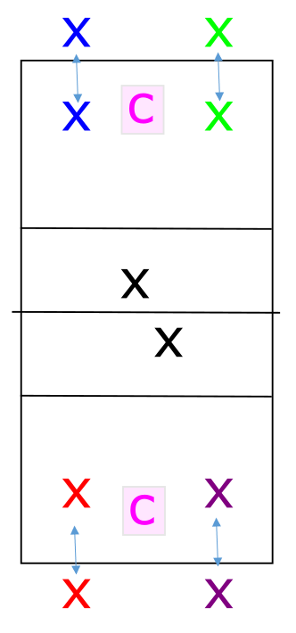 I like to position the coaches with a ball cart in middle-back on each side. Since your servers have to hit a lot of controlled serves in a short period of time, they are going to miss some serves. And if you are doing this drill specifically BECAUSE you have been missing a lot of serves, that will be especially true!3 So in that case, I have the coaches there to enter a replacement serve to either of the two passers across the net in the event of a missed serve.