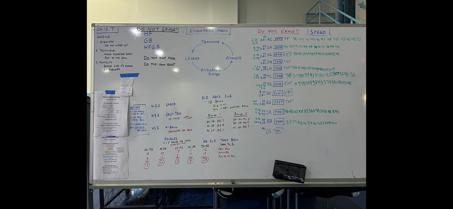 The right-hand portion with initials and a whole bunch of numbers for each player is for speed/power training. (You can see that there’s times for short sprints on the left, spike velocity on the right, some jump touches in there as well, etc). As you can see, most of that is written up by players, as they do their workouts. I curate it before practice by erasing most of it and updating personal bests.