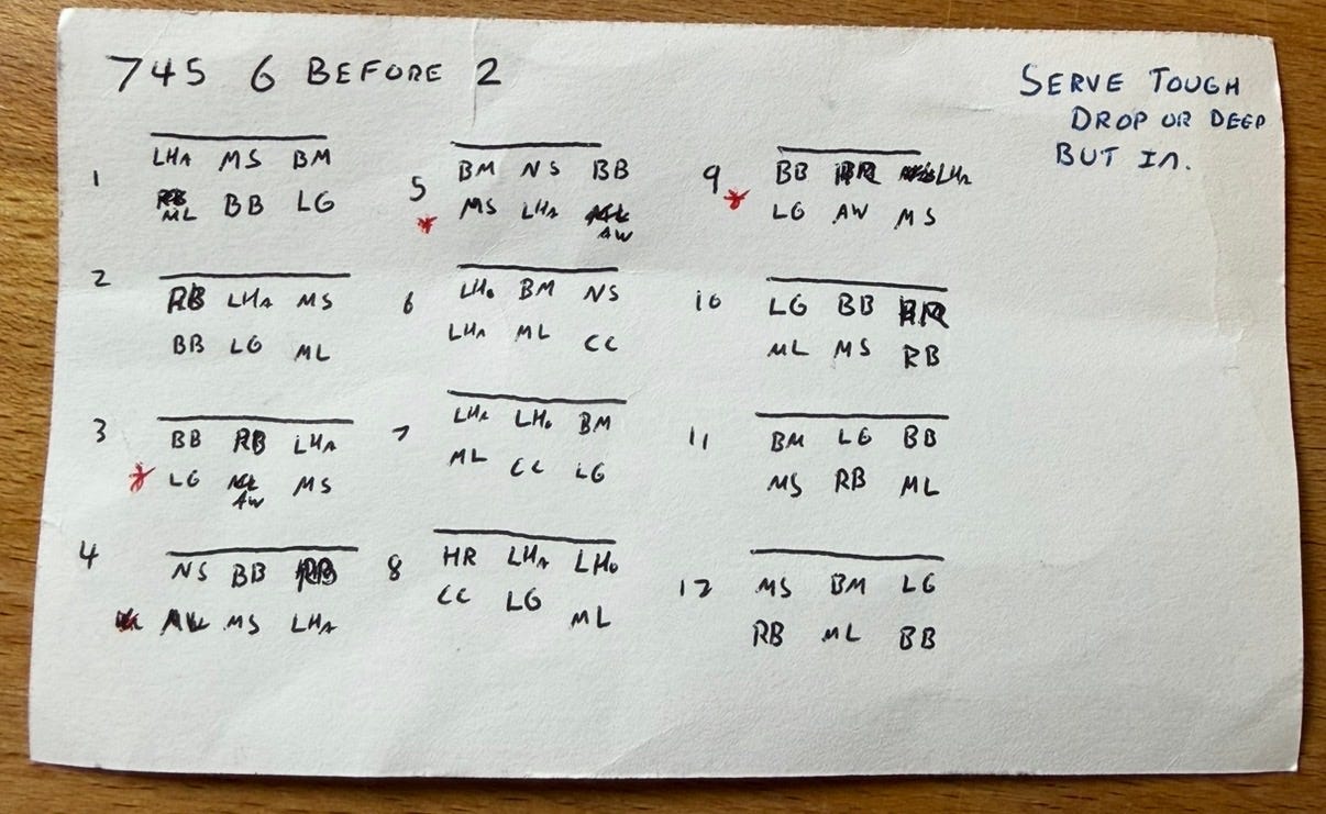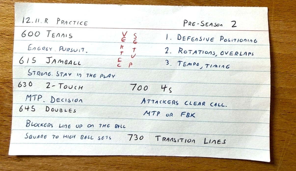 This is good to do when you have a whiteboard, but one nice thing about an index card is that your assistant coach can have a little more personalized script for them during practice. Many head coaches in club volleyball struggle to utilize their assistants, because assistant coaches might not be as experienced, and you don’t have time for lengthy pre-practice meetings, like you might have on a college staff. Even when I was an assistant on college or pro staffs, I would usually write my own little cards to remind myself of what my head coach tasked me to do.