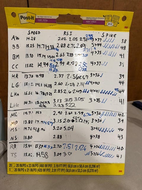 Because of that, the only thing I can really logistically haul back and forth to the gym is this little 2’ tall guy from Walmart or wherever I got it. So you can see here: no practice plans, no long-term stuff, etc. Just enough space for all the players to write their speeds and scores and goals on there and for me to take a picture to record it at the end of the day. But hey, that’s got value.