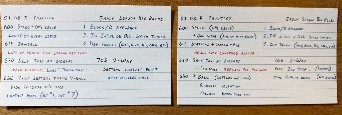Big Rocks in the top-right of the front. And then I have the practice schedule, along with 1 or 2 emphases written in blue for each drill. Those are the things that I’m coaching in those drills. And honestly, that’s the purpose of the index card. At this point, I can run some of my go-to Practice Templates in my sleep in terms of the timing and flow of practice. But what requires mindful engagement is what you’re actually coaching in each activity.