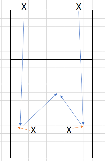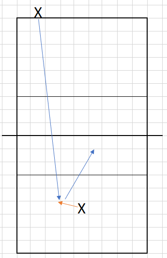 Above are two diagrams of outside angles. I drew them with down-the-line serves for clarity, but these situations can happen off crosscourt serves. They can also occur to the zone 6 passer.