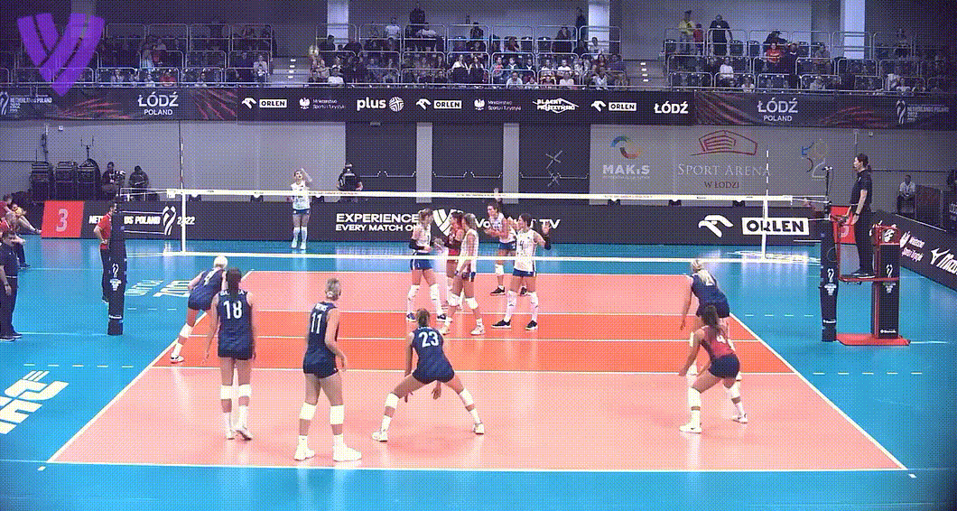 Pretty classic example of an Outside Angle here. Passer is moving to her left and directing the ball back toward the target. I sometimes refer to this as a Closed Angle, because the passer closes off her angle relative to the target.