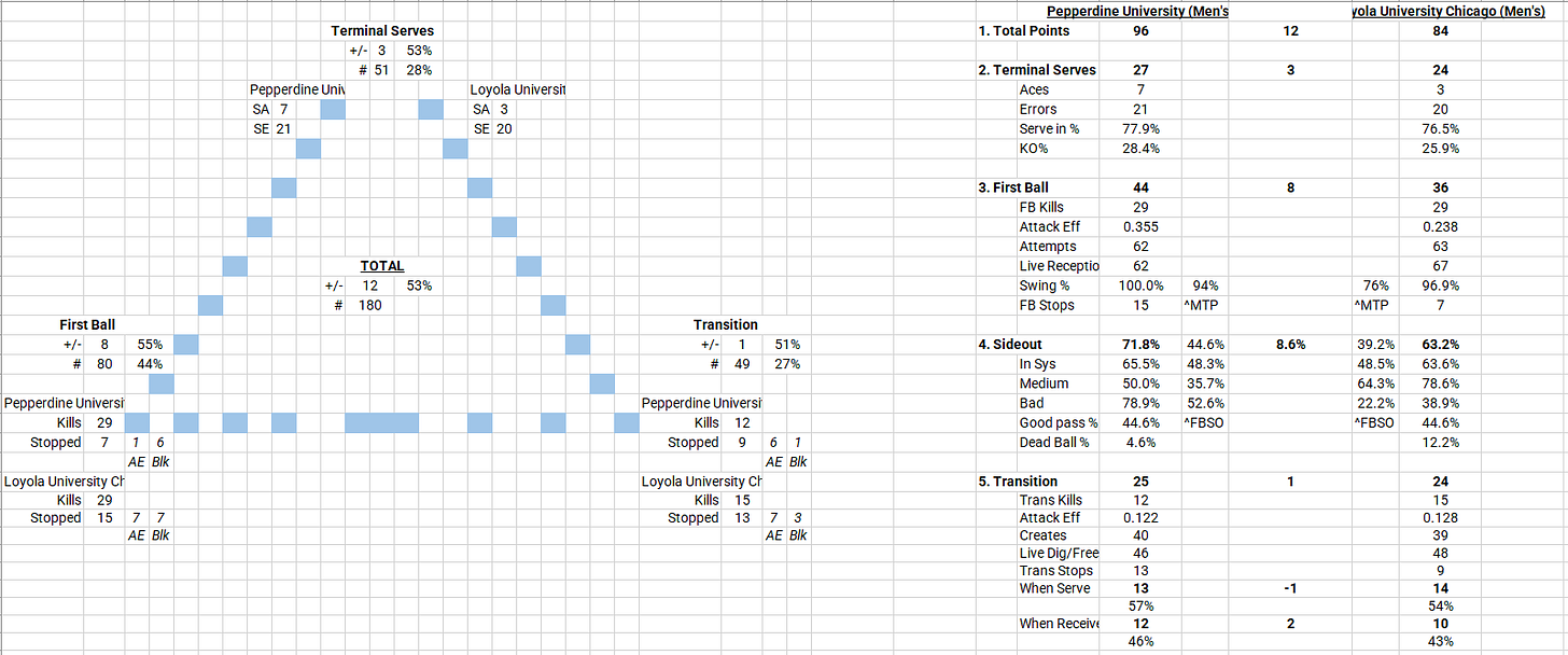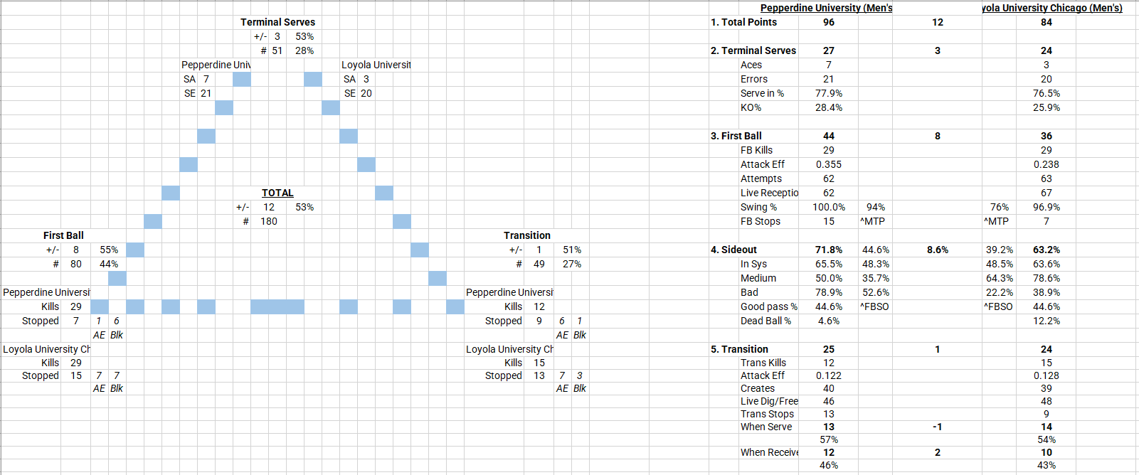 I highlighted the quarterfinal playoff match between Loyola and Pepperdine as one of the most interesting ones to watch. I forecast a super-tight Pepperdine victory with Pepp earning a small edge in Terminal Serving, the teams playing even in Transition, and Pepp hitting about 0.310 in First Ball.