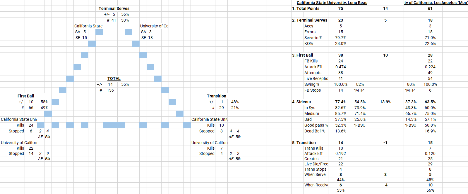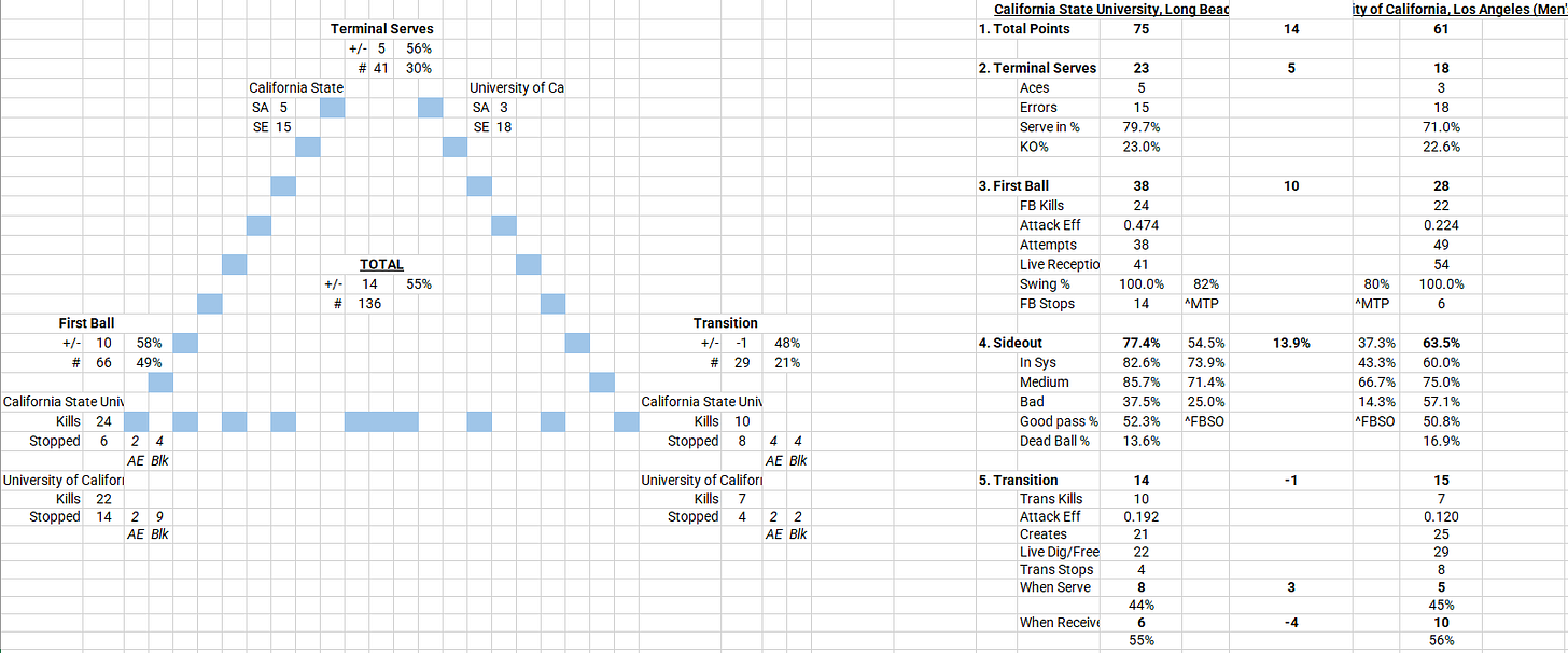 Long Beach was dominant in First Ball- particularly with their block. They stuffed UCLA 9 times on 49 First Ball attempts. And they were super-terminal: 24 kills on 38 of their own attempts.