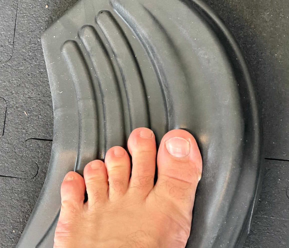 When you do the Toe Pulses, sink your heel down so it’s almost touching the ground and then pulse your toes into the crest of the Toepro as hard as you can for 30s.