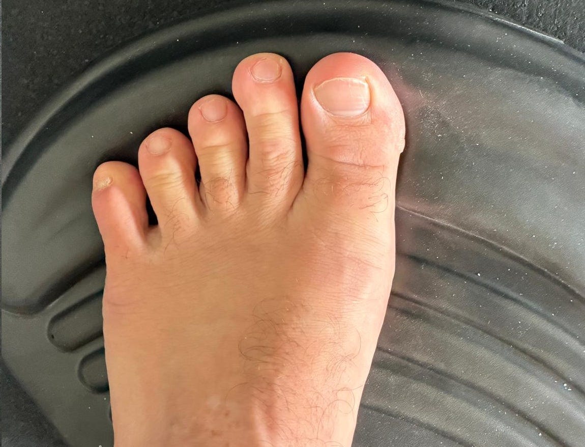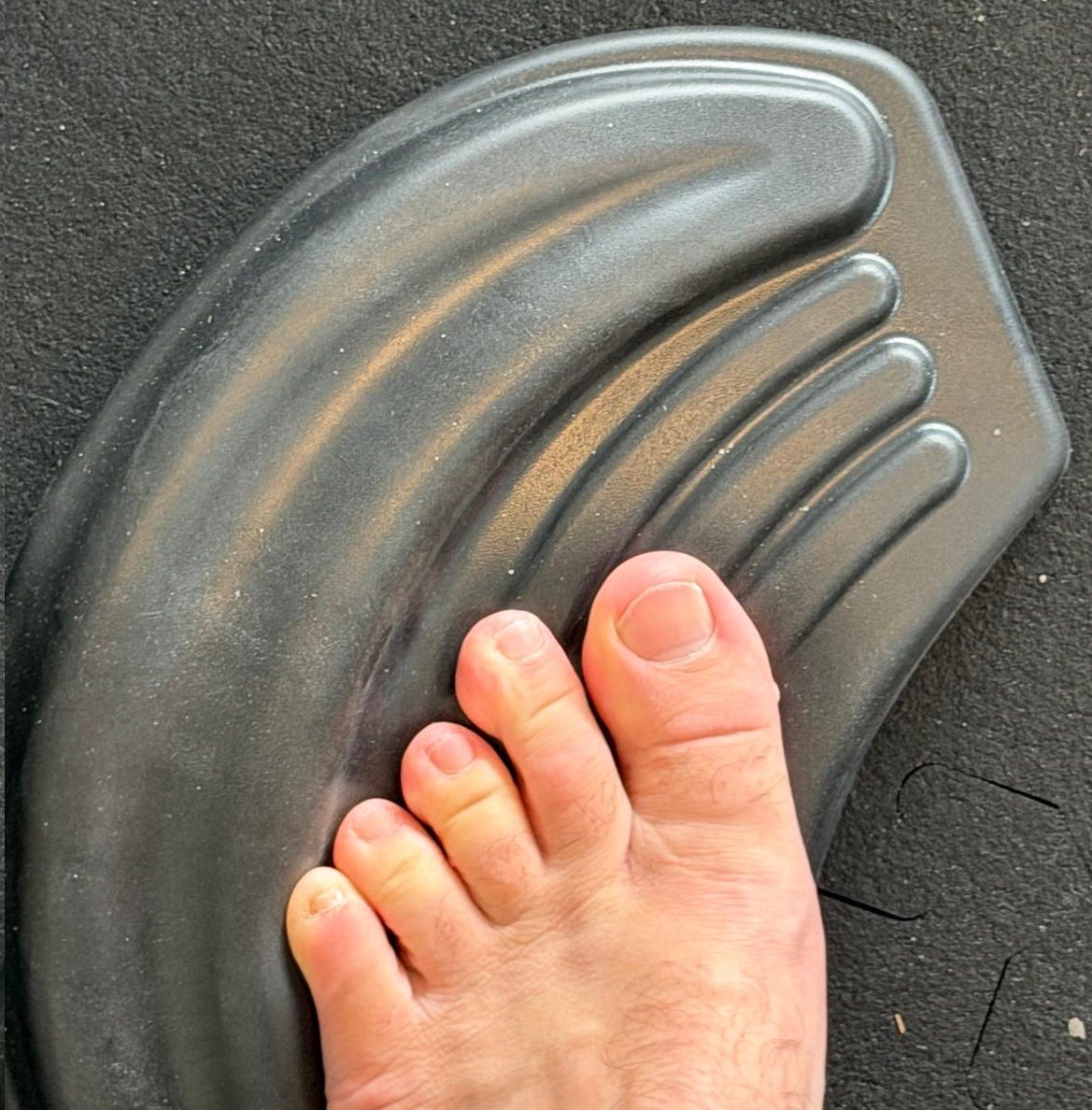 Now you’ll orient sideways. There’s a vertical crest that divides the Toepro and I find I get the best feel if I have my big toe go over that. When you do the Calf Bounces you bend your knee slightly and bounce your heel up and down for 30s, same as in Position 1. Try to keep your body straight up and down and not buckle in at the bottom. (This is the whole point of the Toepro: it puts your foot and ankle in different positions, which builds strength and resilience.)